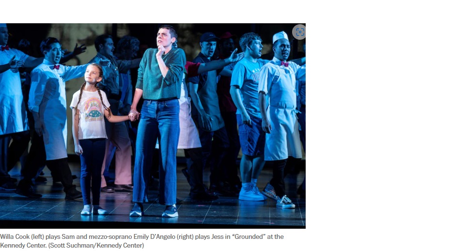 “Grounded” originated as a one-person play written by George Brant after he had made a deep study into the phenomenon of drone warfare and the personnel who directed the drones. The play found an audience and culminated with an off-Broadway production starring Ann Hathaway in 2015. The opera came about owing to the Metropolitan Opera’s current zeal for commissioning new works to attract new audiences. The Met commissioned playwright Brant to work with the established composer Jeanine Tesori to refashion “Grounded” as a full-blown opera and gave the Washington Opera an opportunity to give it a trial run.
