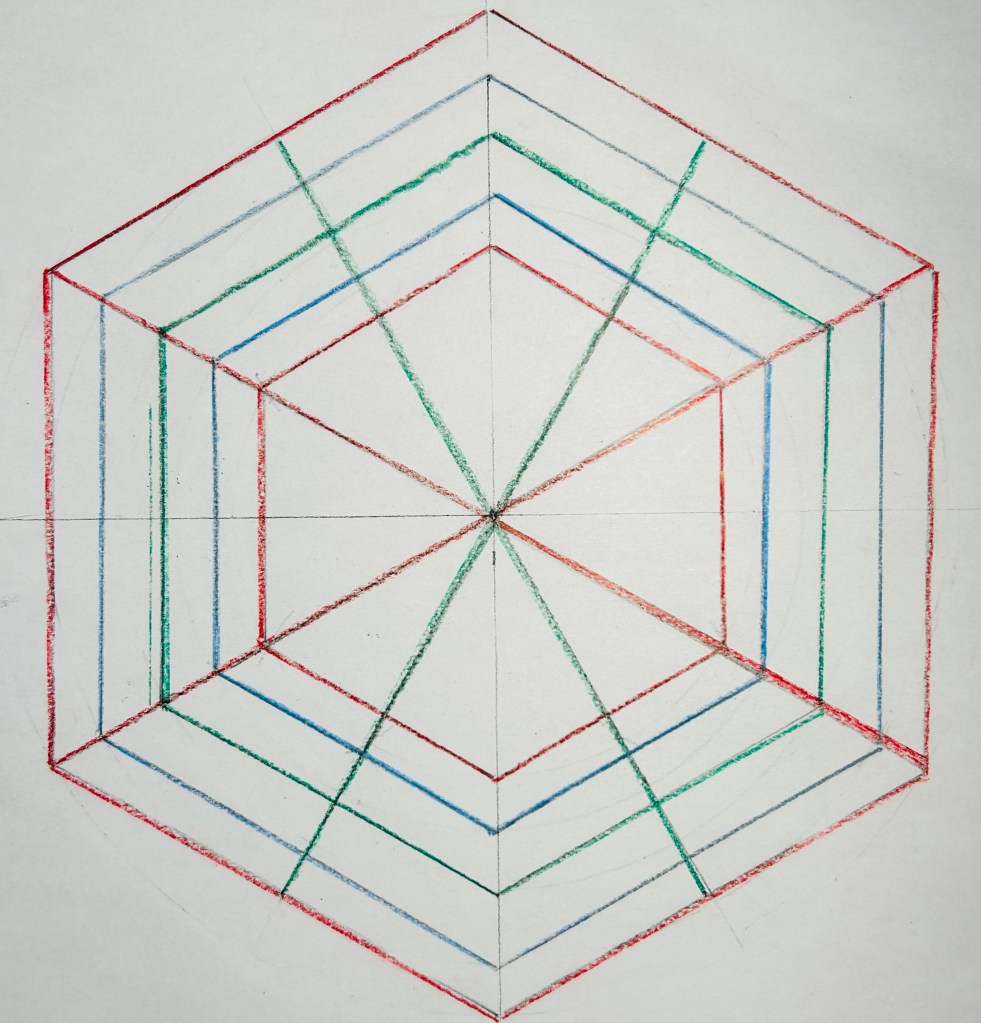 Using what I learned from creating the “Flower of Life”, I was able to easily construct a pattern of 5 concentric hexagons. It involved simply using a compass to draw four concentric circles around the central circle. Then the directional lines used to create the first internal hexagram are extended outward to intersect the concentric circles. The six intersection points on the circumference of each circle become the six points of the hexagon. I added a little color to highlight its mandala character.
