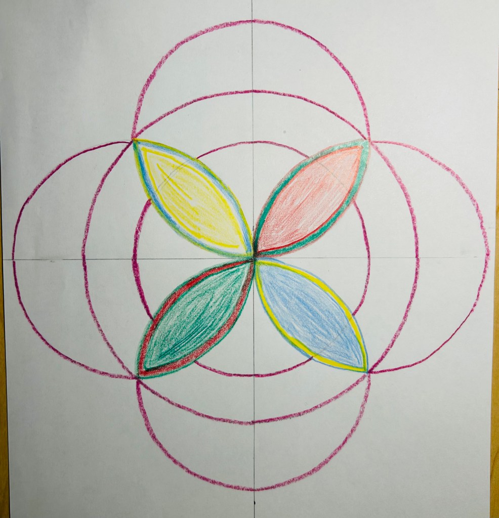 It took me a few attempts to get a satisfying result. After meditating on it for a bit, I decided to color in a four-petal flower pattern that emerges. I also used a red pencil to highlight the circumferences of all six circles. I was pleased with this first foray into creating a mandala.