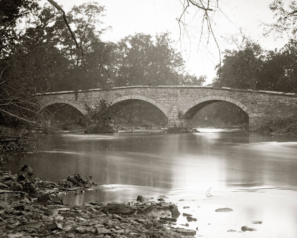 Meanwhile, on the Union left, Gen. Burnside and his IX Corps waited hours for authority to attack. Lee used the time wisely, shifting forces to shore up his weakened positions elsewhere on the battlefield, so there were only 4,000 Confederates remaining when Burnside finally sent 13,000 Yankees to cross Antietam Creek and attack. But Burnside proceeded cautiously and directed his troops to cross the bridge over the shallow creek rather than attempt to ford it on foot. A band of Georgia marksmen focused their rifle fire on the bridge, delaying Burnside’s troops from crossing for over two hours. It was 3pm before Burnside’s troops finally reached the fields south of Sharpsburg.